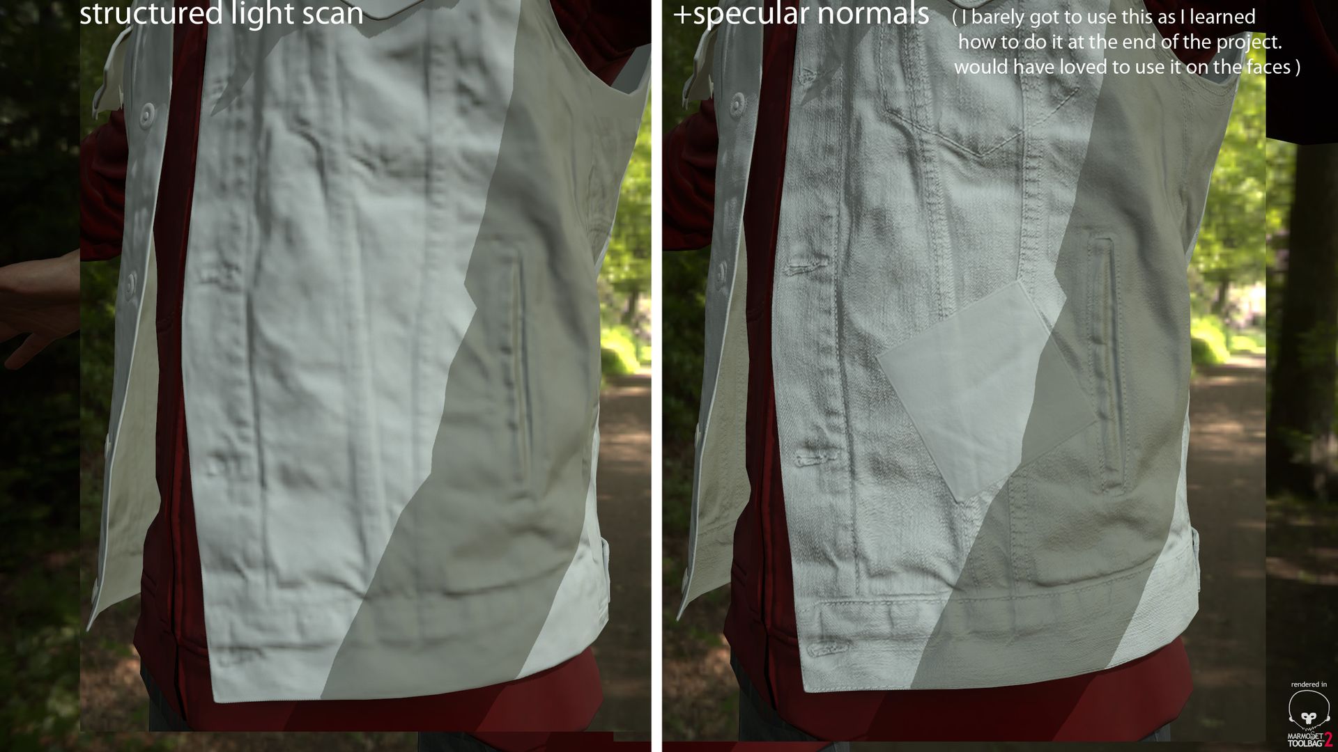 Frequency Separation tool I made for Substance that allows for easier clone stamping out features without messing up the large forms too much. Used for quick dirty changes requested by legal at last minute. Kept us from needing to go all the way back to Zbrush and rebaking everything (The jacket was made by someone else. This is me just showing others how the new tool works)